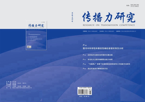 《传播力研究》杂志旨在为高校文化、新闻、传媒、传播学类专业师生、文化传播理论研究者开展学术交流与研讨提供高端而坚实的平台。主要收稿范围:文化、影视、文艺、新闻、传媒等行业深度报道;传播业态、传播创新、传播理论、媒介经营与管理等专题研究;报纸、广播、电视、期刊、新媒体等实践经验;媒体改革新思路、新观点、新方法等。本刊系中国知识资源总库、中文科技期刊数据库、中国核心期刊(遴选)数据库、中国科技论文统计源数据库、万方数字化知识服务平台等大型学术数据库收录期刊,在本刊发表的论文可在职称评定、晋升考核以及岗位竞聘中起到重要科研认定作用。